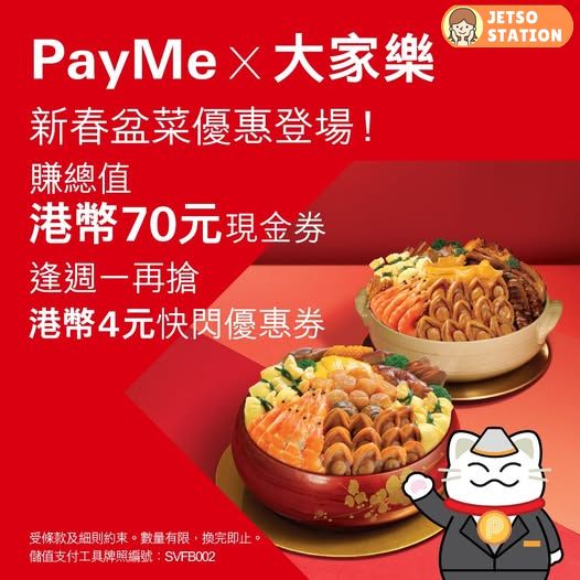 買大家樂嘅新春盆菜,記得用PayMe畀錢,可以賺大家樂現金券。去大家樂門市或大家樂網店eatCDC購買,都能夠使用PayMe優惠。