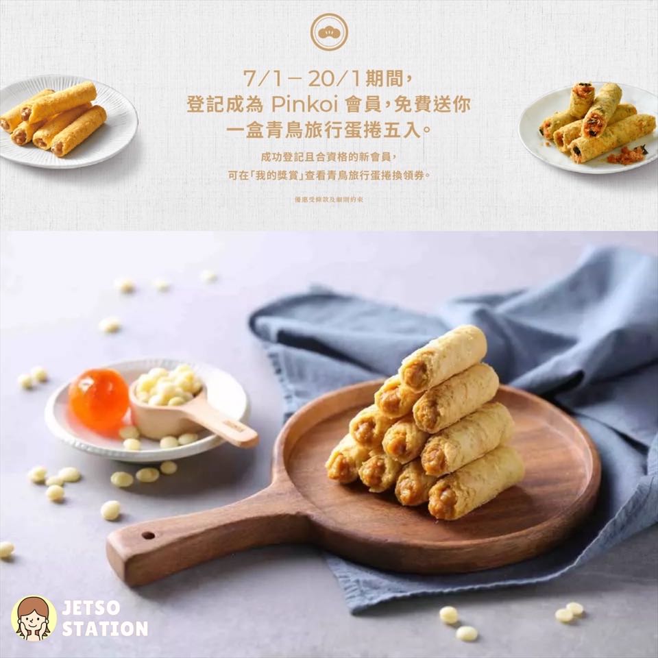 兌換方法:凡成功登記成為新會員,即可於 Pinkoi 開運祭期間限定店將軍澳 PopCorn,換領「青鳥旅行」蛋卷五入裝乙盒(數量有限,送完即止)