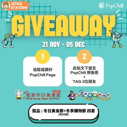嚟緊PopChill會在冬季購物展又同大家見面,現送出冬日美食節 x 冬季購物節 35套門票 (每套4張)