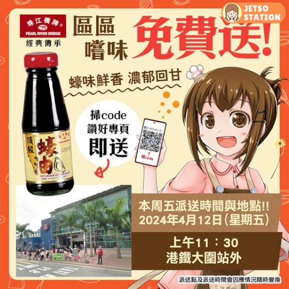 區區嚐味【珠江橋牌頂級蠔油】免費派送活動再開~~!這次會來到又一個港鐵大圍站外🌼!是一個很開揚的位置啊!大家都來掃掃code讚一讚、領取返支【頂級蠔油】來試試味道吧!