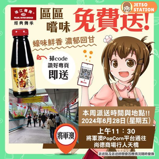注意注意!明天星期五的區區嚐味【珠江橋牌頂級蠔油】免費派送活動,將會來到 #將軍澳!就在將軍澳PopCorn平台通往尚德商場行人天橋 上,終於也來到將軍澳了!大家來領取頂級蠔油之後就快點去商場涼冷氣吧!