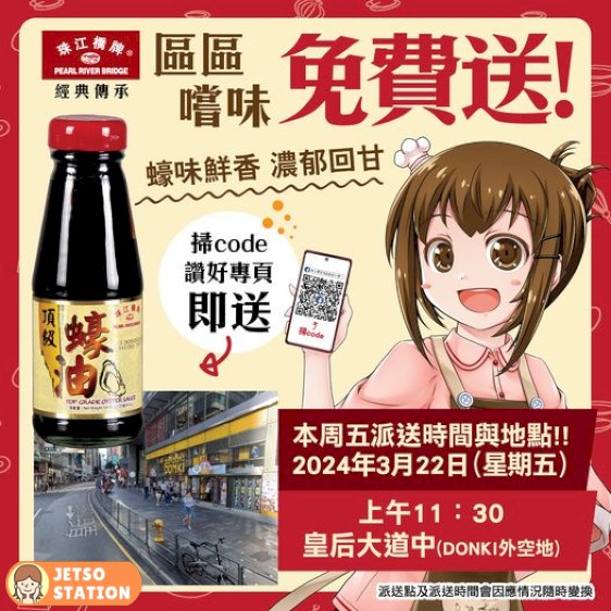 注意當預定數量派完即止,而由於當天地點人流、天氣與路況等關係,派送點及派送時間會因應情況隨時變換,敬請留意留意!蠔味鮮香、濃郁回甘!大家都來轉用【珠江橋牌頂級蠔油】吧!