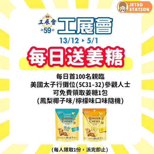 每日首100名親臨美國太子行攤位人士可免費領取姜糖一包(口味隨機,價值$20)