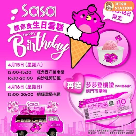 莎莎45歲生日啦!為答謝全城祝福,再慶祝埋消費券派發 ,SASA將於4月15-16日請大家食生日「雪糕」,只要親臨莎莎雪糕車,讚好或追蹤莎莎Facebook專頁及Instagram帳號,即可獲生日雪糕1杯,仲送莎莎登機證連$10優惠券*。更可即場體驗莎莎周年環球好物,讓你能享受從世界各地搜羅的潮流好物。