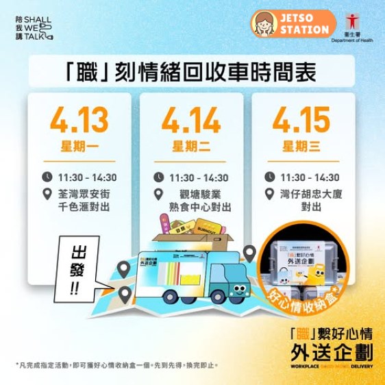 放完復活節長假,急需返工「好心情」?幫緊你幫緊你!下星期一至三(4月13-15日),Shall We Talk「職」繫好心情外送企劃將會派出「職」刻情緒回收車去以下3個地區!即刻約埋同事, Lunch hour 過去搵我哋唞唞,順便帶走埋「好心情收納盒」啦!