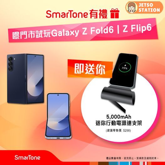 無需出機都有禮物收 ?真係咁筍㗎 !而家只要嚟SmarTone門市試玩Galaxy Z Fold6 | Z Flip6,即送你5,000mAh 迷你行動電源連支架(建議零售價: $298)。試吓機就有禮,精明嘅你點可以錯過啊!