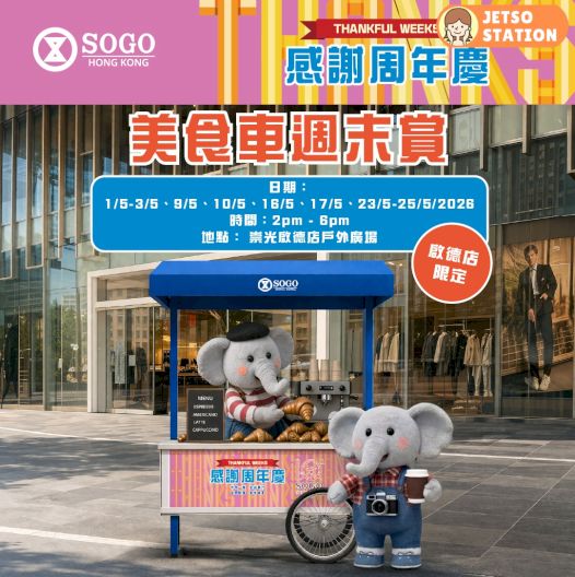 崇崇同崇崇妹已經將美食車駛到嚟崇光啟德店,喺 5 月嘅指定週未為大家送上「美食車週末賞」! 等大家喺 Thankful Weeks 掃貨之餘,仲可以 Chill 住嘆返份美食!