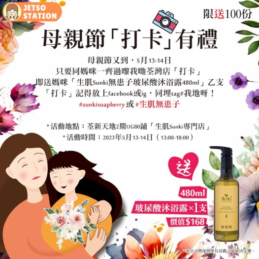 母親節即將來臨,來生肌荃灣店與母親影下合照打卡,將合照分享至社交平台,tag上生肌官方社交帳號,同埋 #sunkisoapberry 或 #生肌無患子 ,更可獲得由生肌贈送的【無患子玻尿酸沐浴露】480ml乙支。