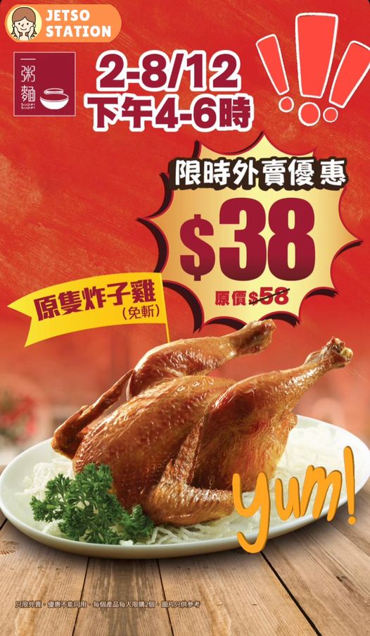 一粥麵推出新一期$38優惠活動!由即日起至12月8日期間,購買原隻炸子雞,每隻震撼價$38 (原價$58),即可品嚐外皮炸得酥脆,肉質鮮嫩爆汁又啖啖肉的炸子雞!