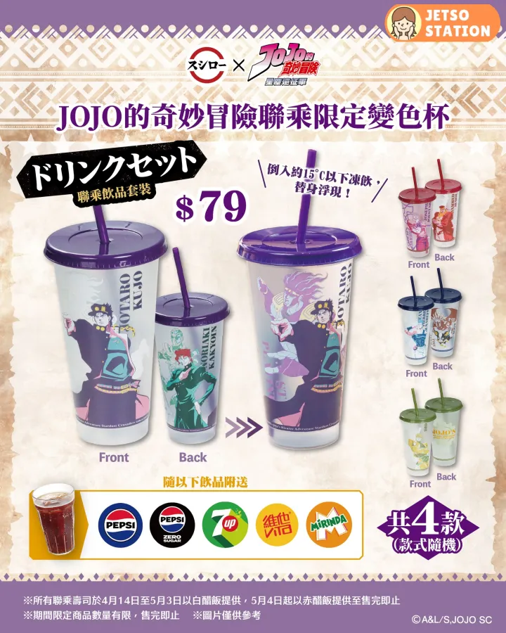 香港壽司郎與經典日本動漫《JOJO的奇妙冒險》合作,推出限定變色杯系列,即日起於全線分店發售!