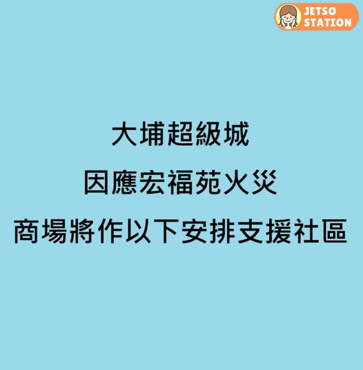 (2025-11-26 21:04) 因應宏福苑火災,大埔超級城支援社區如下: