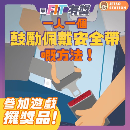 【至FIT有獎】戴好安全帶 由你做起!喺交通意外發生時,戴啱安全帶可以起到重要嘅保護作用,但咁重要嘅動作唔係每個人都有做到!即刻參加「一人一個鼓勵佩戴安全帶嘅方法!」有獎遊戲,分享鼓勵商用車司機、乘客佩戴安全帶嘅方法,做齊所有步驟,隨時有機會拎走至FIT禮品!
