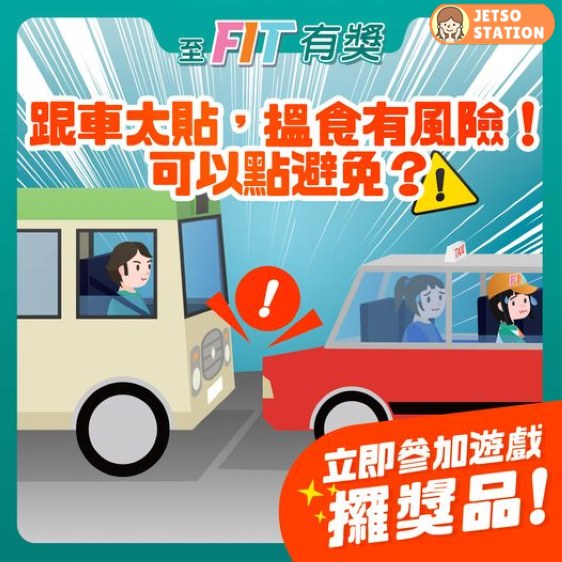 跟車太貼,搵食有風險!有咩方法可以避免?即刻參加「一人一個避免跟車太貼的方法」有獎遊戲,分享一個避免跟車太貼嘅方法,同埋簡單解釋原因,以及做齊所有步驟,就有機會拎走至FIT禮品啦!