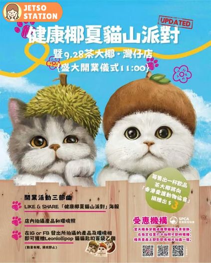 為慶祝第七間分店開幕,茶大椰邀請你參加今次活動,活動主題「健康椰夏貓山派對」,除咗開心派禮品之外,仲會用行動捐贈香港愛護動物協會!