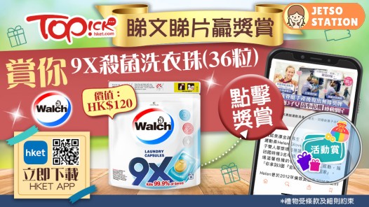 參加者只需於活動期間打開hket App瀏覽「TOPick」文章,並點撃「活動賞」按鈕,每日點撃最多的會員即有機會贏得威露士9X 殺菌洗衣珠(36粒) (名額400位)。有獎遊戲只限TOPick會員參加,如未下載hket App,請按【立即下載】; 如非TOPick會員,請登記成為會員。