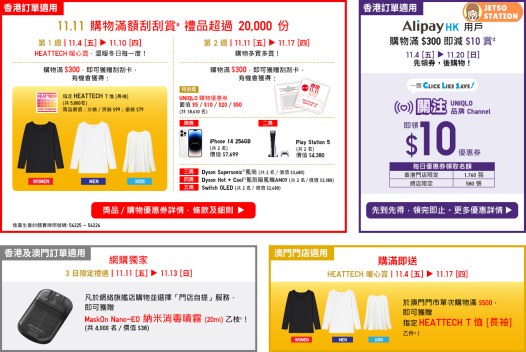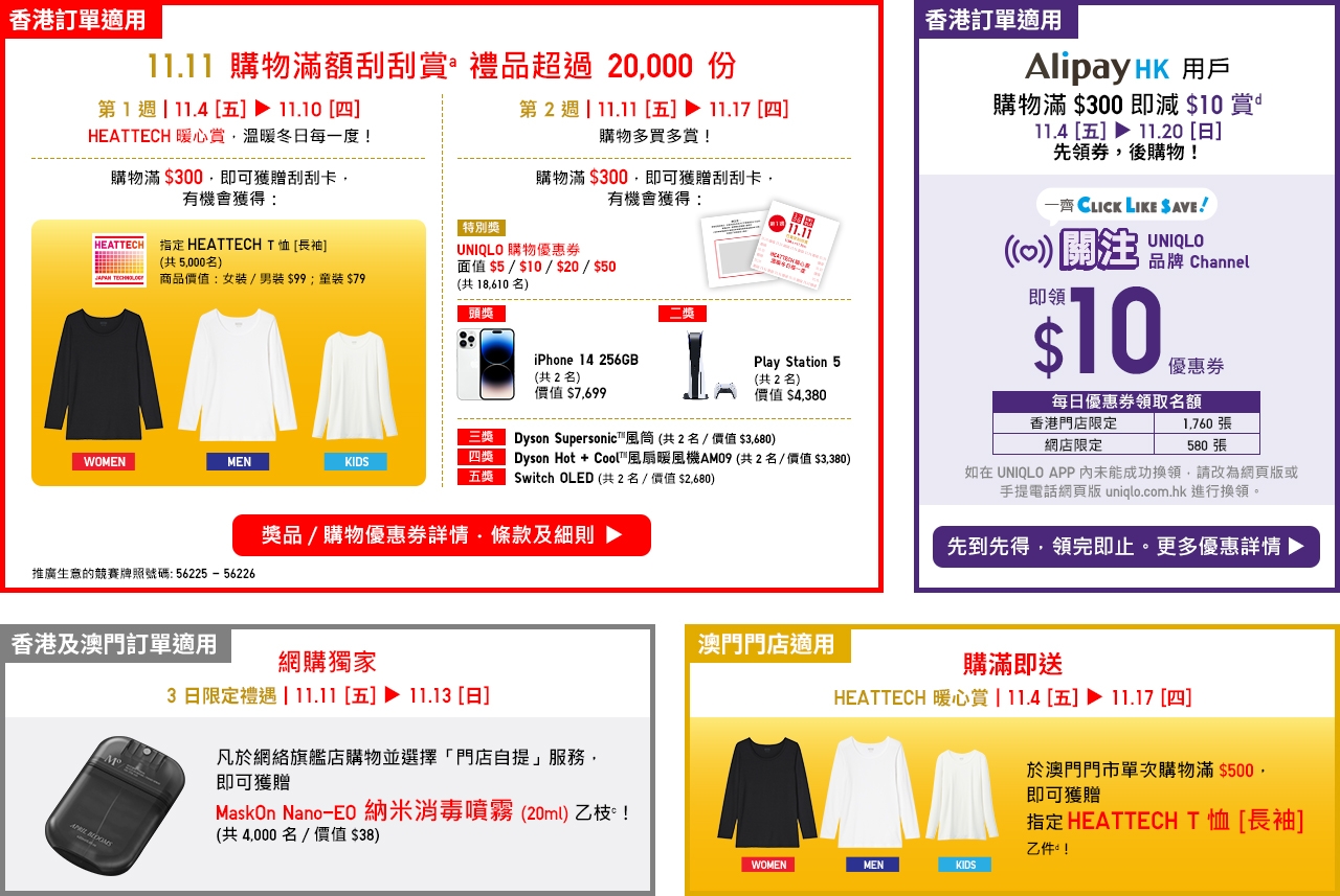 在11月4日至11月10日期買滿$300即獲贈刮刮卡,UNIQLO會送出5000件指定HEATTECH長袖T恤,包括男、女及童裝。在11月11日至11月17日期間買滿$300會獲贈另一款刮刮卡,UNIQLO將送出iPhone 14(256GB)、PS5、Dyson風筒、Dyson暖風機、Switch OLED遊戲機各2部及超過18000張UNIQLO購物優惠劵。