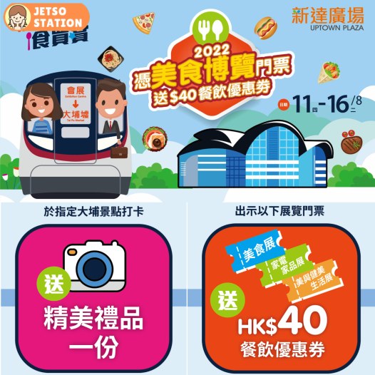 美食博覽開鑼搶唔到$1蚊鮑魚? 唔洗失望! 只要出示「美食博覽2022」門票即賞你$40餐飲贈劵 ! 同期舉辦嘅「美與健生活博覽」 、 「家電 ‧ 家品 ‧ 博覽」都可以享受優惠! 快閃優惠至8月16日,每日名額30個,每人每日限換一次。