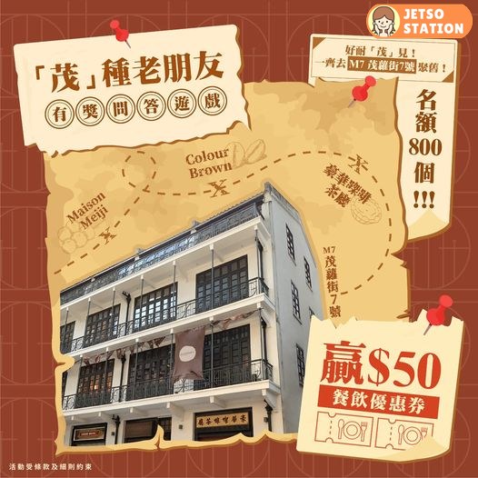 由即日起至10月5日期間,首800名完成以下指定參加步驟嘅得獎者,就可以獲得港幣50元餐飲優惠券壹(1)張!優惠券適用於M7三間特色餐廳 #ColourBrown、#豪華㗎啡茶廳 同 #MaisonMeiji ,準備好就立即參加贏走一趟時空旅行,穿梭富有舊香港情懷嘅建築之中 ,品嚐新舊交融嘅味蕾盛宴 !