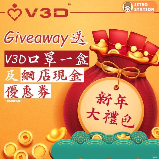 【V3D新年送大禮】多謝大家踴躍參與上次嘅Giveaway活動,見到上次反應咁熱烈,加上又就嚟新年,我哋緊係做個Giveaway,送吓大禮俾大家啦!!今次送出嘅獎品有V3D Health網店現金優惠券,同埋V3D品牌口罩1盒。