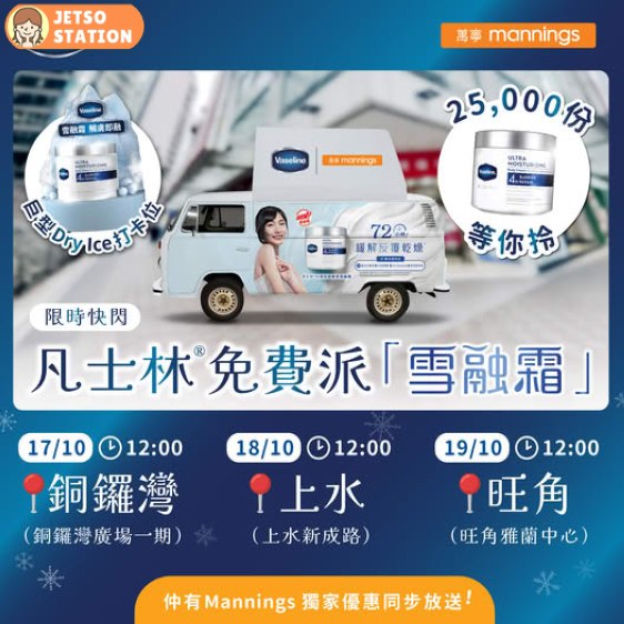 由10月17至19 日到指定快閃打卡點,有25,000 份免費「凡士林®雪融霜30G試用裝」& 萬寧 $10產品優惠券等你拎,送完即止!