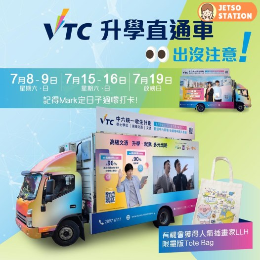 VTC文憑至學位直通車 !!出沒注意!!趁大家開始放暑假,我哋都準備好落區同大家分享最新嘅升學資訊,俾你了解吓多元升學路同埋唔同嘅課程選擇,中六同學仲可以放榜前預早部署啱自己嘅升學路。第一次同大家見面,當然唔少得準備咗精美見面禮,只要即場完成簡單任務就有機會獲得VTC校友兼人氣插畫家LLH嘅限量版tote bag!(數量有限,送完即止)
