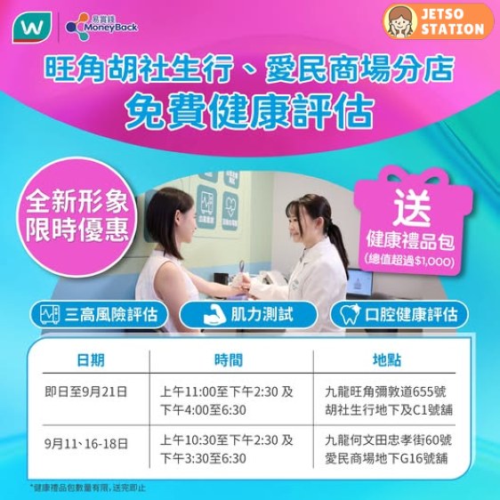 旺角胡社生行分店同愛民商場分店已經以全新形象示人啦,仲會係指定日期提供免費健康評估!評估會涵蓋三高風險、肌力測試等等慢性疾病風險評估,同埋口腔健康評估等等。完成評估之後,仲送你總值超過$1,000嘅健康禮品包添呀!禮品包數量有限,送完即止,唔想錯過嘅就要快啲嚟啦!