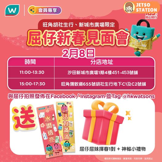 而且係活動期間只要同屈仔影相發佈係Facebook / Instagram,再Tag Watsons,仲可以得到限量屈仔屈妹揮春1對 + 神秘小禮物添呀~仲唔快啲mark 實日子,約埋朋友到時一齊走快兩步嚟同屈仔見面啦!