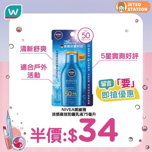 NIVEA 涼感高效防曬乳液:性價比極高 實測好評防曬乳液;水感質地,極易推快,特有涼爽配方;防曬系數SPF50 及 PA++++