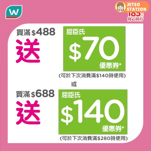 – 買滿$488 送$70屈臣氏優惠券* 或 買滿$688 送$140屈臣氏優惠券^