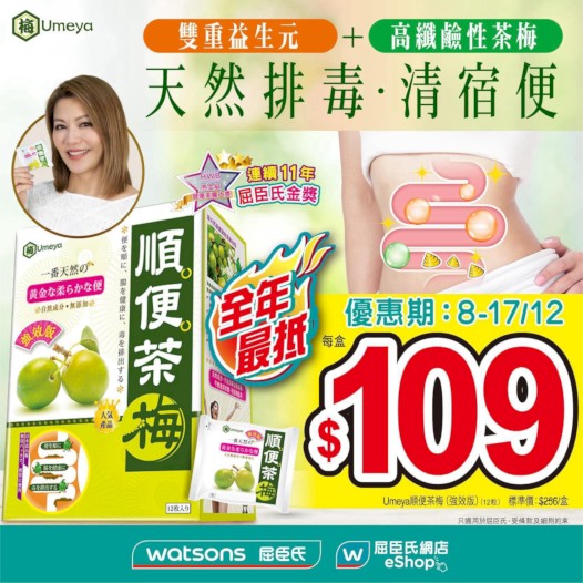 【Umeya順便茶梅】結合雙重益生元+高纖鹼梅青梅 只要每日1粒,100%清宿便 天然排毒 日日痾出黃金便便 連星級用家 #康子妮 都大推!而家嚟屈臣氏買【Umeya順便茶梅】就可享全年最抵優惠 $109/盒* (標準價:$256) ,快啲去屈臣氏掃貨啦