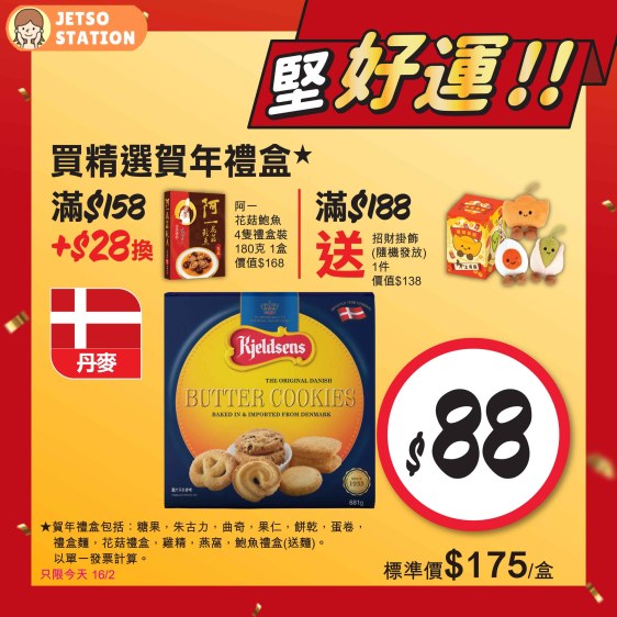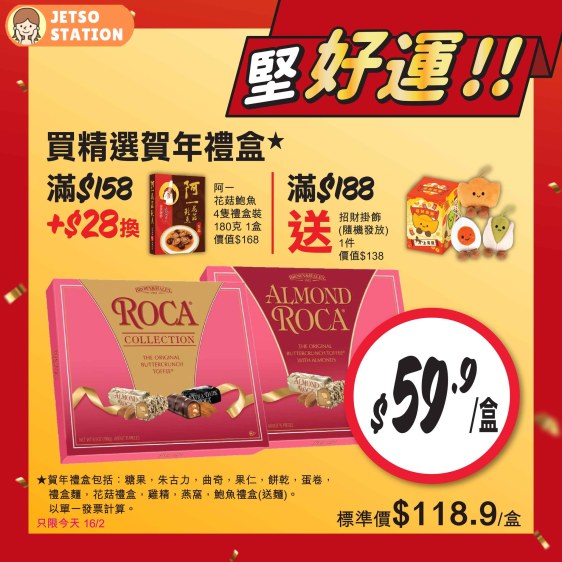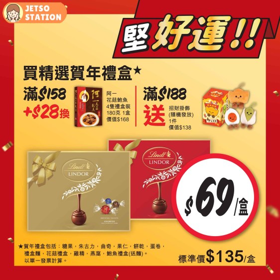 優質賀年禮品盡在惠康,準備好一齊迎新歲,同親朋好友分享喜悅!今個星期有澳洲空運塔斯曼尼亞紅寶石車厘子28毫米+ 、阿一祿福袋、壽桃開運福喼2026、丹麥藍罐牛油曲奇、嘉頓家庭什餅、樂家杏仁糖/混合裝杏仁糖#、瑞士蓮精選/牛奶軟心朱古力禮盒、奔富Maxs各款紅/白酒同埋軒尼詩VSOP干邑!