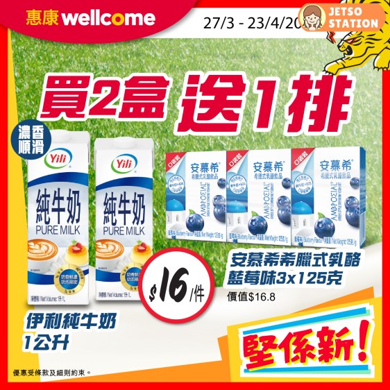 – 伊利純牛奶1公升 優惠價$16/件,買2盒送1排安慕希希臘式乳酪藍莓味3×125克(價值$16.8)*