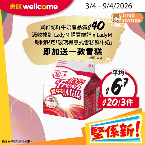 買維記鮮牛奶產品滿$40,憑收據到Lady M指定分店購買期間限定「玻璃樽意式雪糕鮮牛奶系列 」, 即送額外一款雪糕口味 (價值$20)