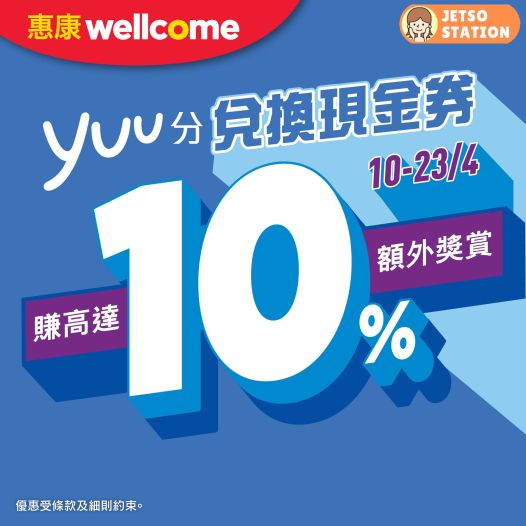平時買嘢精打細算嘅你,儲儲埋埋咁多yuu分仲未用?機會嚟喇!4月10日至23日期間,用yuu積分兌換現金券,即享高達10%獎賞回贈,再嚟惠康掃貨就慳更多!