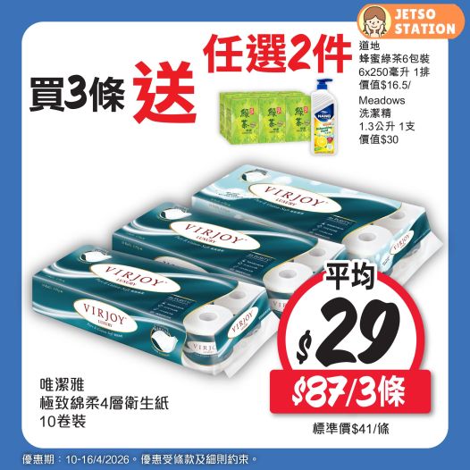 – 唯潔雅極致綿柔衛生紙,$87/3條,送道地茶類飲品6×250毫升1排/ Meadows洗潔精1.3公升1支(任選兩件)!