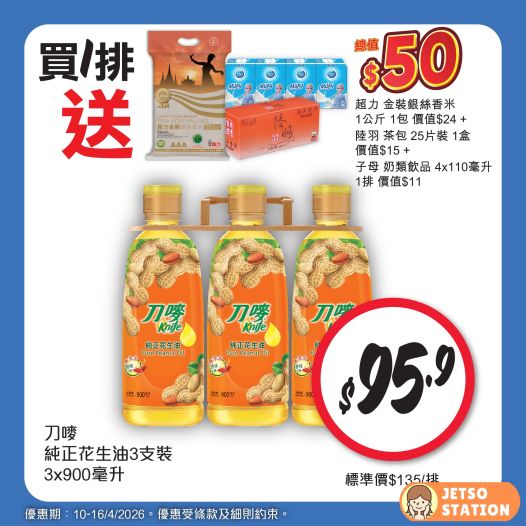 – 刀嘜純正花生油3支裝,$95.9,送總值$50禮品!