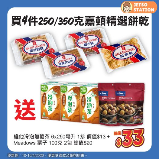 – 買4件精選嘉頓餅乾,送維他冷泡無糖茶6×250毫升1排+Meadows栗子2包,總值$33!
