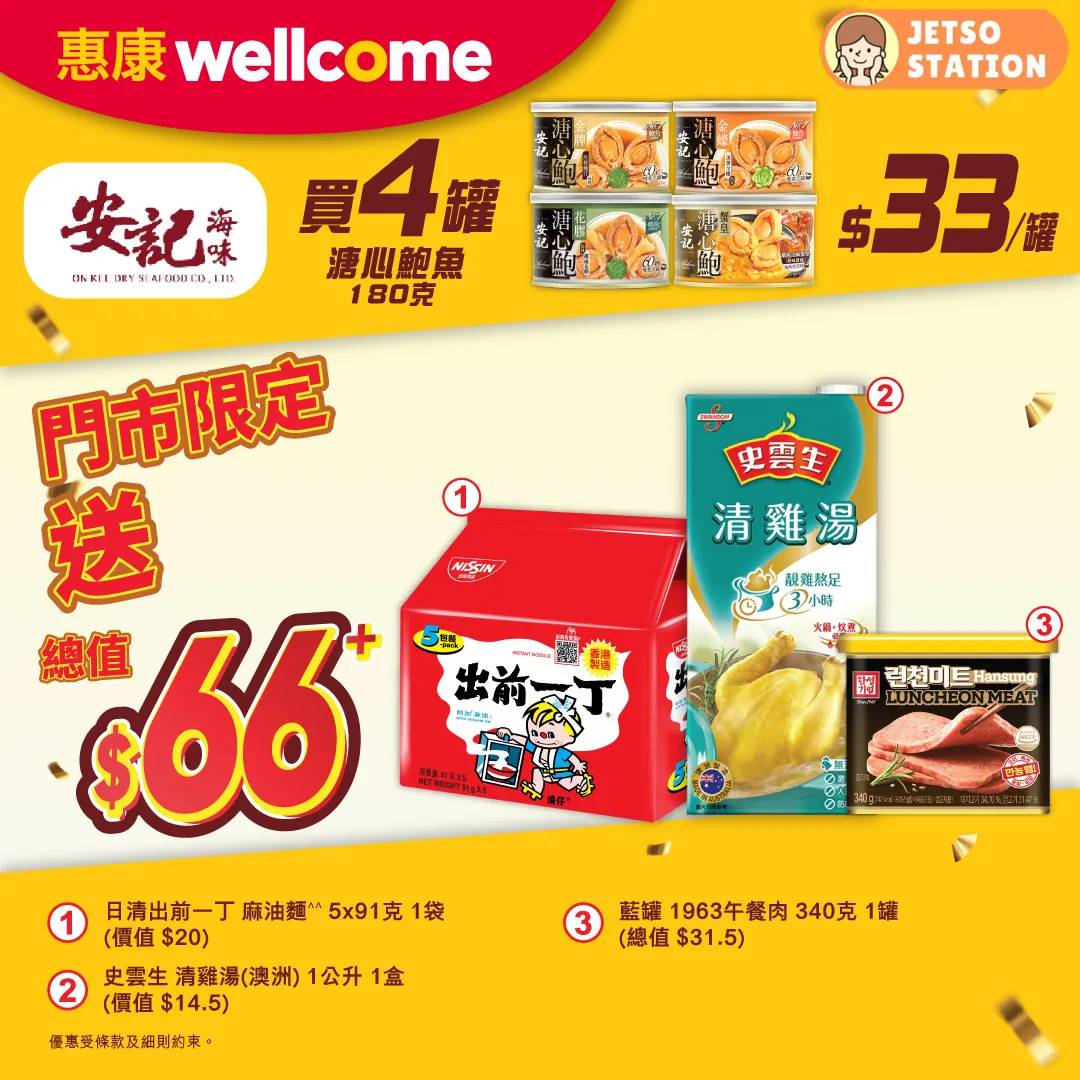 +買4罐安記海味溏心鮑魚180克,送1袋日清出前一丁麻油麵^^ 5包裝 5×91克(價值$20)、1盒史雲生清雞湯(澳洲) 1公升(價值$14.5)及1罐藍罐1963午餐肉 340克 (價值 $31.5)