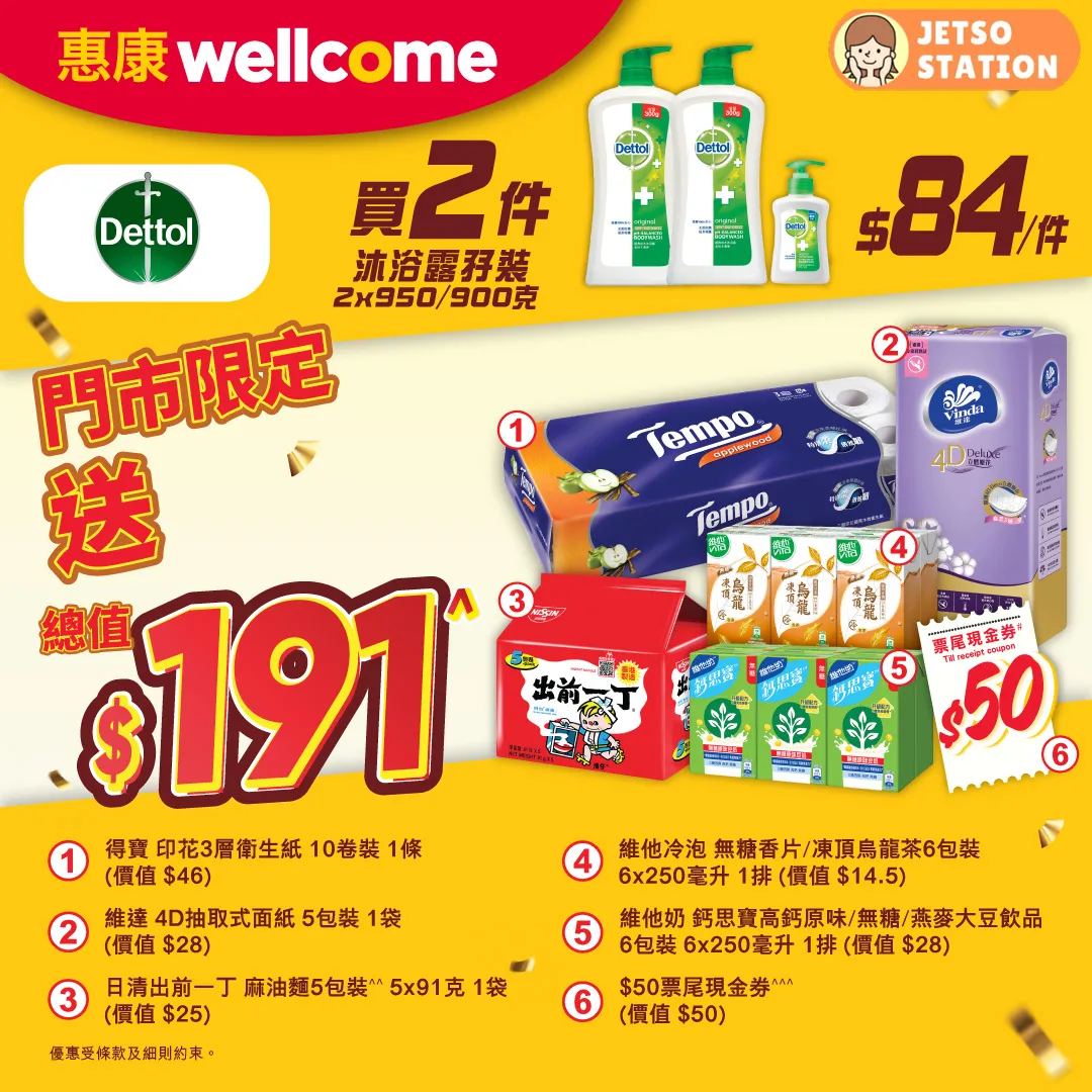 ^買2件滴露沐浴露孖裝 2 x 950/ 900毫升,送1條得寳印花3層衛生紙10卷裝(價值$46)、1袋維達4D抽取式面紙5包裝(價值$28)、1袋日清出前一丁麻油麵^^5包裝(價值$25)、1排維他冷泡無糖香片/凍頂烏龍茶6包裝 6×250毫升(價值$14.5)、1排維他奶鈣思寳高鈣原味/無糖/燕麥大豆飲品6包裝 6×250毫升(價值$28)及$50票尾現金券^^^(價值$50)