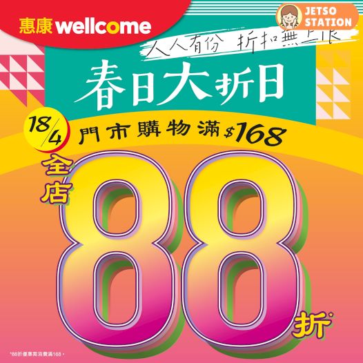 【春日大折日 4月18日惠康門市全店88折*!! 人人有份,折扣無上限!】