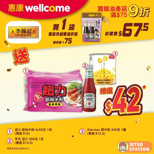 *買1袋李錦記舊裝特級蠔油孖裝,送1袋超力銀絲米粉5×65克(價值$16)、1支亨氏茄汁300克(價值$13.5)及1罐Starmax粟米粒340克(價值$12.5),禮品總值$42。買蠔油產品滿75,可享9折