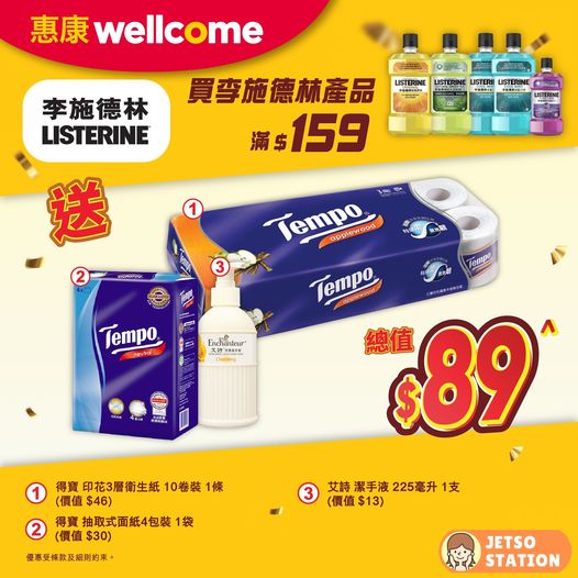 ^買李施德林產品滿$159,送1條得寶印花3層衛生紙10卷裝(價值$46)、1袋得寶抽取式面紙4包裝(價值$30)及1支艾詩潔手液225毫升(價值$13),禮品總值$89 (贈品價值以標準價計算)
