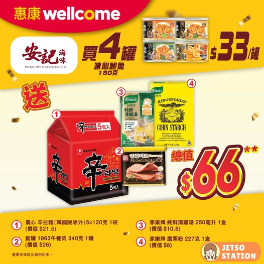 **買4罐安記海味溏心鮑魚180克,送1袋農心辛拉麵(韓國版除外)5×120克(價值$21.5)、1罐藍罐1963午餐肉340克(價值$26)、1盒家樂牌純鮮清雞湯250毫升(價值$10.5)及1盒家樂牌鷹粟粉227克(價值$8),禮品總值$66