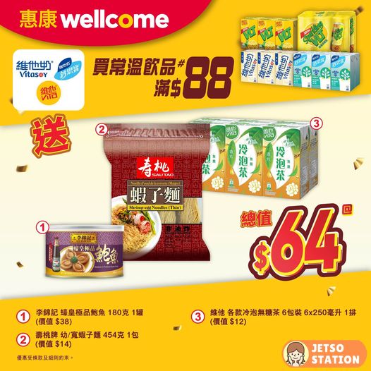 @買維他奶/鈣思寶/維他常溫飲品#滿$88,送1罐李錦記蠔皇極品鮑魚180克(價值$38)、1包壽桃牌幼/寬蝦子麵454克(價值$14)及1排維他各款冷泡無糖茶6包裝6×250毫升(價值$12),禮品總值$64