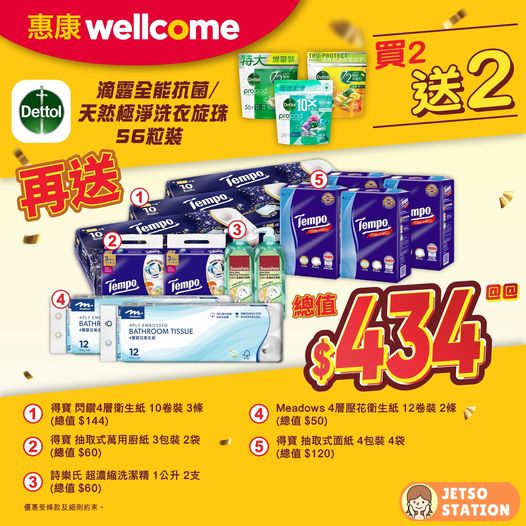 @@滴露全能抗菌/天然極淨洗衣旋珠56粒裝買2送2 (只限同款同價錢產品),再送3條得寶閃鑽4層衛生紙10卷裝(總值$144)、2袋得寶抽取式萬用廚紙3包裝(總值$60)、2支詩樂氏超濃縮洗潔精1公升(總值$60)、2條Meadows4層衛生紙12卷裝(總值$50)及4袋得寶抽取式面紙4包裝(總值$120) (贈品價值以標準價計算)