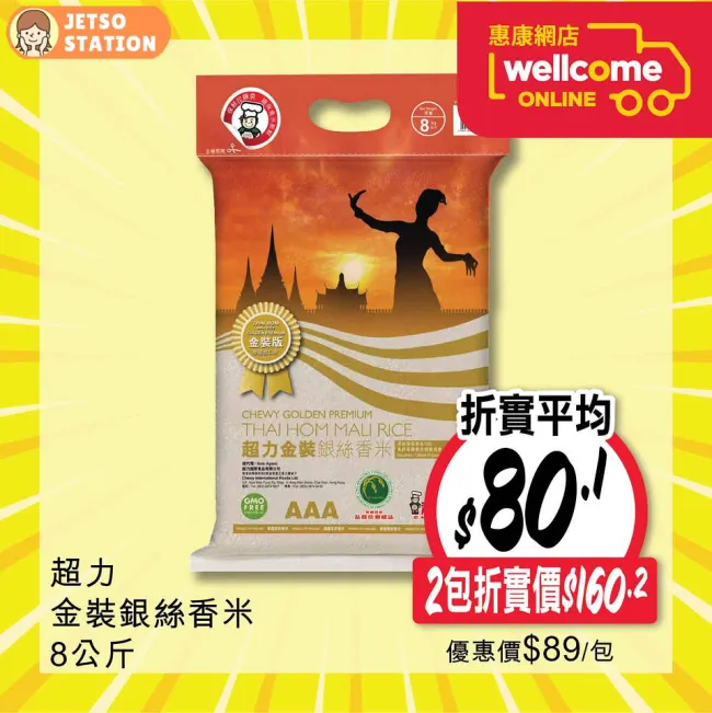 – 超力 金裝銀絲香米 8公斤 → 2包折實$160.2,平均$80.1/包