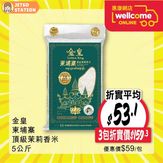 – 金皇柬埔寨頂級茉莉香米 5公斤 → 買3包折實$159.3,平均$53.1/包