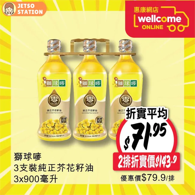 – 獅球嘜 3支裝純正芥花籽油 3×900毫升 → 2排折實$143.9,平均$71.95/排