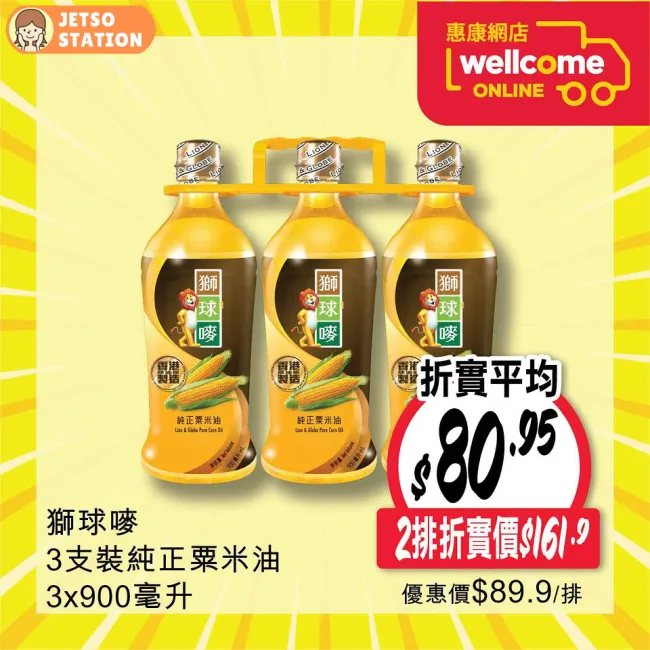 – 獅球嘜 3支裝純正粟米油 3×900毫升 → 2排折實$161.9,平均$80.95/排