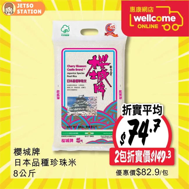 – 櫻城牌 日本品種珍珠米 8公斤 → 2包折實$149.3,平均$74.7/包